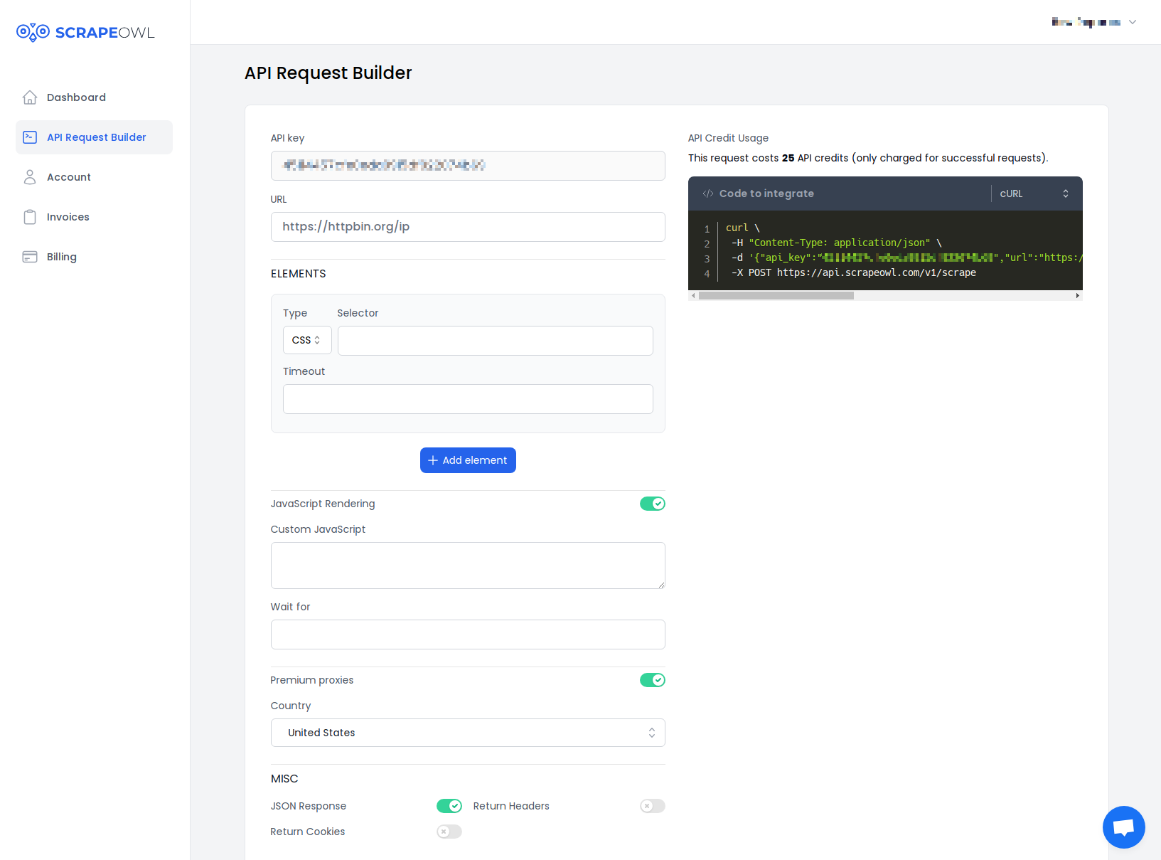 Scrapeowl is a credit-based service where each scrape request can cost 1-25 credits depending on the used features and proxy level.